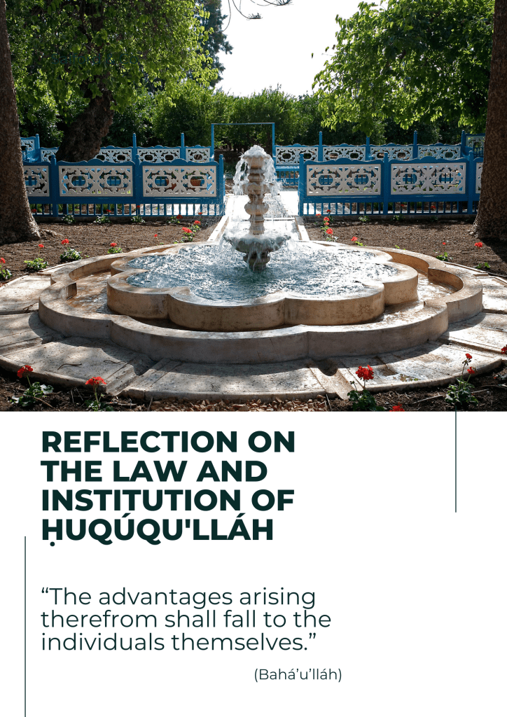 The Institution of Ḥuqúqu’lláh will, during the course of this Dispensation, contribute towards the spiritualization of humanity through the promotion of a new attitude to the acquisition and use of material resources. It will provide the material resources necessary for great collective enterprises designed to improve all aspects of life; and will be a powerful element in the growth of a world civilization.
